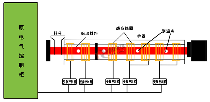 ⑵安全可靠:料筒外壁經高頻電磁作用發(fā)熱,熱量利用充分,基本無散失。熱量聚集于加熱體內部,電磁線圈表面溫度略高于室溫,可以安全觸摸,無需高溫防護,安全可靠。